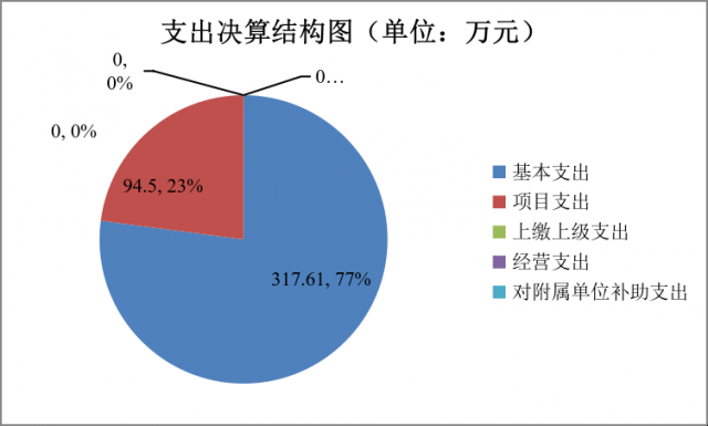2024年度本年支出合计412.11万元,其中:基本支出317.61万元,占77.07%;项目支出94.5万元,占22.93%;上缴上级支出0万元;经营支出0万元;对附属单位补助支出0万元。