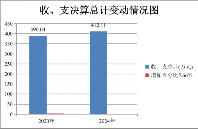 2024年度收入、支出总计均为412.11万元。与2023年度相比,收入、支出总计各增加22.07万元,增长5.66%。主要变动原因是2024年人员变动,调进5人,相应工资、人员经费等增加。