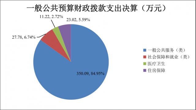 2024年度一般公共预算财政拨款支出412.11万元,主要用于以下方面:一般公共服务支出350.09万元,占84.95%;教育支出0万元;科学技术支出0万元;文化旅游体育与传媒支出0万元;社会保障和就业支出27.78万元,占6.74%;卫生健康支出11.22万元,占2.72%;住房保障支出23.02万元,占5.59%。