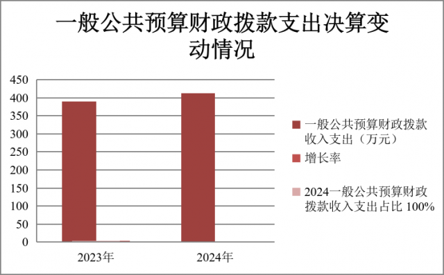 2024年度一般公共预算财政拨款支出412.11万元,占本年支出合计的100%。与2023年度相比,一般公共预算财政拨款支出增加22.07万元,增长5.66%。主要变动原因是2024年人员变动,调进5人,相应工资、人员经费等增加。