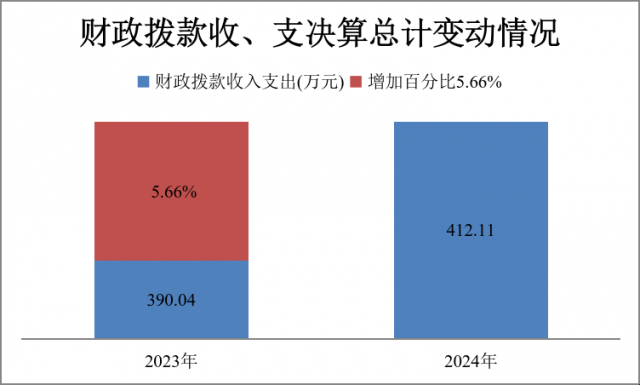 2024年度财政拨款收入、支出总计均为412.11万元。与2023年度相比,财政拨款收入总计、支出总计各增加22.07万元,增长5.66%。主要变动原因是2024年人员变动,调进5人,相应工资、人员经费等增加。