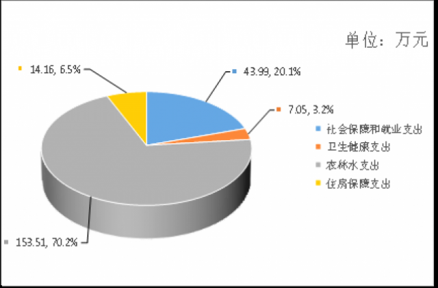 2024年度一般公共预算财政拨款支出219.16万元,主要用于以下方面:社会保障和就业支出43.99万元,占20.1%;卫生健康支出7.05万元,占3.2%;农林水支出153.51万元,占70.2%;住房保障支出14.61万元,占6.5%。