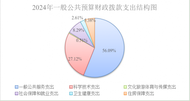 2024年度一般公共预算财政拨款支出1323.99万元,主要用于以下方面:一般公共服务支出742.67万元,占56.09%;科学技术支出359.02万元,占27.12%;文化旅游体育与传媒支出6.74万元,占0.51%;社会保障和就业支出109.8万元,占8.29%;卫生健康支出34.52万元,占2.61%;住房保障支出71.25万元,占5.38%。