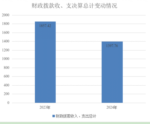 2024年度财政拨款收入、支出总计均为1397.76万元。与2023年度相比,财政拨款收入总计、支出总计各减少459.66万元,下降24.75%。主要变动原因是项目支出减少,导致一般公共服务支出及农林水支出相应减少。