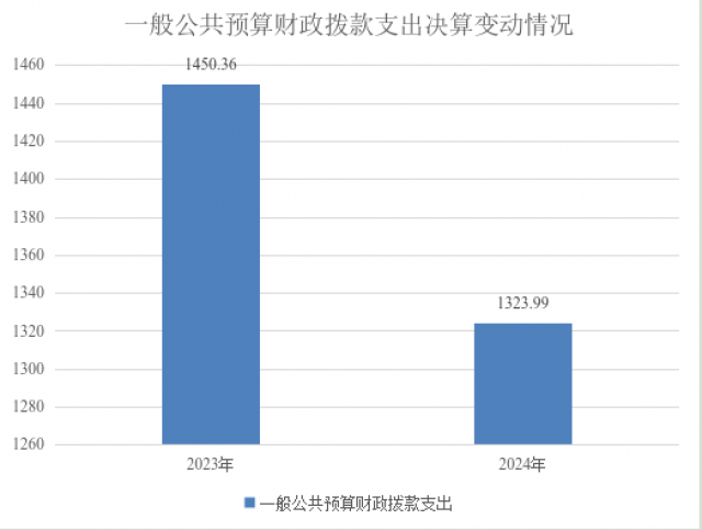 2024年度一般公共预算财政拨款支出1323.99万元,占本年支出合计的94.72%。与2023年度相比,一般公共预算财政拨款支出减少126.37万元,下降8.71%。主要变动原因是主要变动原因是项目支出减少,导致一般公共服务支出及农林水支出相应减少。