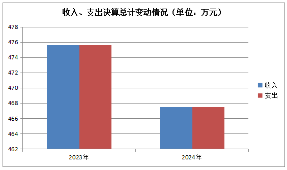 2024年度财政拨款收入、支出总计均为467.48万元。与2023年度相比,财政拨款收入总计、支出总计各减少8.15万元,下降1.7%。主要变动原因是人员退休
