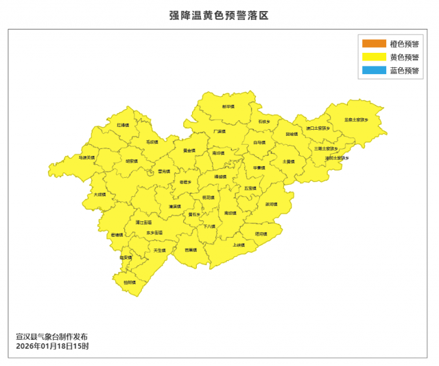 宣汉县气象台2026年01月18日15时57分发布强降温黄色预警:受地面冷空气影响,预计19-21日我县将出现一次强降温天气过程,日平均气温将累计下降7~9℃,局地超过10℃,大部地方有小雨或雨夹雪,高海拔山区有小到中雪,冷空气影响时山口河谷地区有7级及以上偏北大风。请各地各部门密切关注此次强降温、大风天气过程,做好防寒保暖工作,注意防范此次过程对农业、交通、户外作业等带来的不利影响。